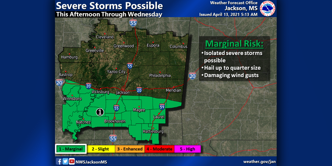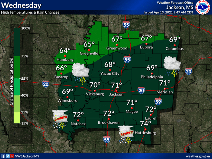 Another rainy day will prevail Wednesday. Severe storms will be possible again on mainly south of the I-20 corridor. Hail and damaging wind gusts will be the main threats with these storms. Expect highs to range from the 60s-70s.