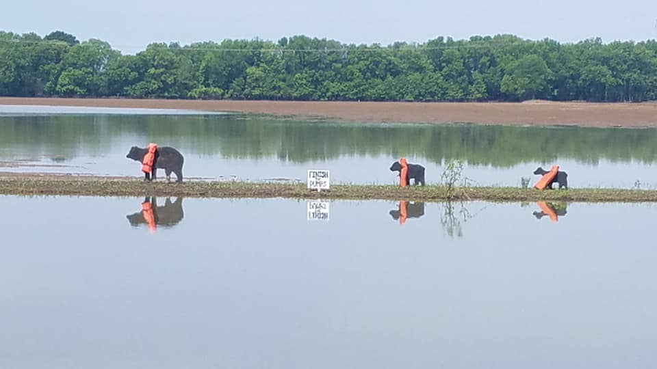 The figures are actually a cutout of the bear and cubs done by Deere and his wife, Stormy. Their property has been underwater most of 2020 and was underwater during the Great Backwater Flood of 2019 as well. They use the cutouts to draw attention to the “Finish the Pumps” sign on their property.