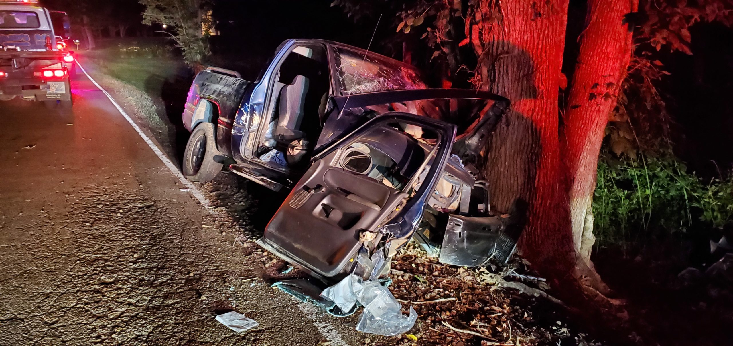 As rescue and both ambulances left the scene, the aftermath was sobering. The items in the back of the truck were scattered in the gully at the side of the roadway. The headlamp and parts of the grill were a hundred feet or so up the road. The doors of the vehicle were standing neatly next to the vehicle. The front of the truck was unrecognizable.