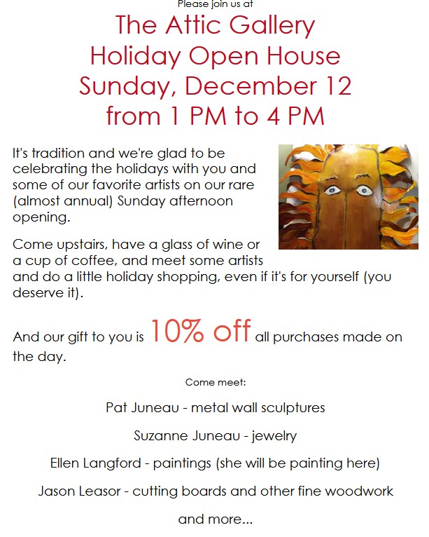 The Attic Gallery is hosting a holiday open house on Sunday from 1 p.m. to 4 p.m. The gallery will be continuing its tradition and hosting an opportunity for the public to meet artists and enjoy a chance to enjoy some holiday shopping.