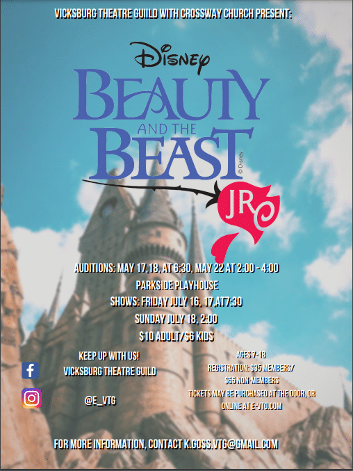 The Vicksburg Theatre Guild will be hosting auditions for Beauty and the Beast Jr. on Monday, Tuesday and Saturday (May 17, 18 and 22) for ages 7 to 18.