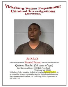 Norfort is wanted by the Vicksburg Police Department and has several warrants out for his arrest.