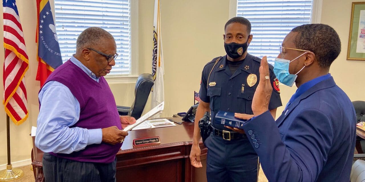 Carlton Phillips is sworn in to service on the Vicksburg Police Department by Mayor George Flaggs Jr. and Chief Milton Moore (photo by Sam Andrews)