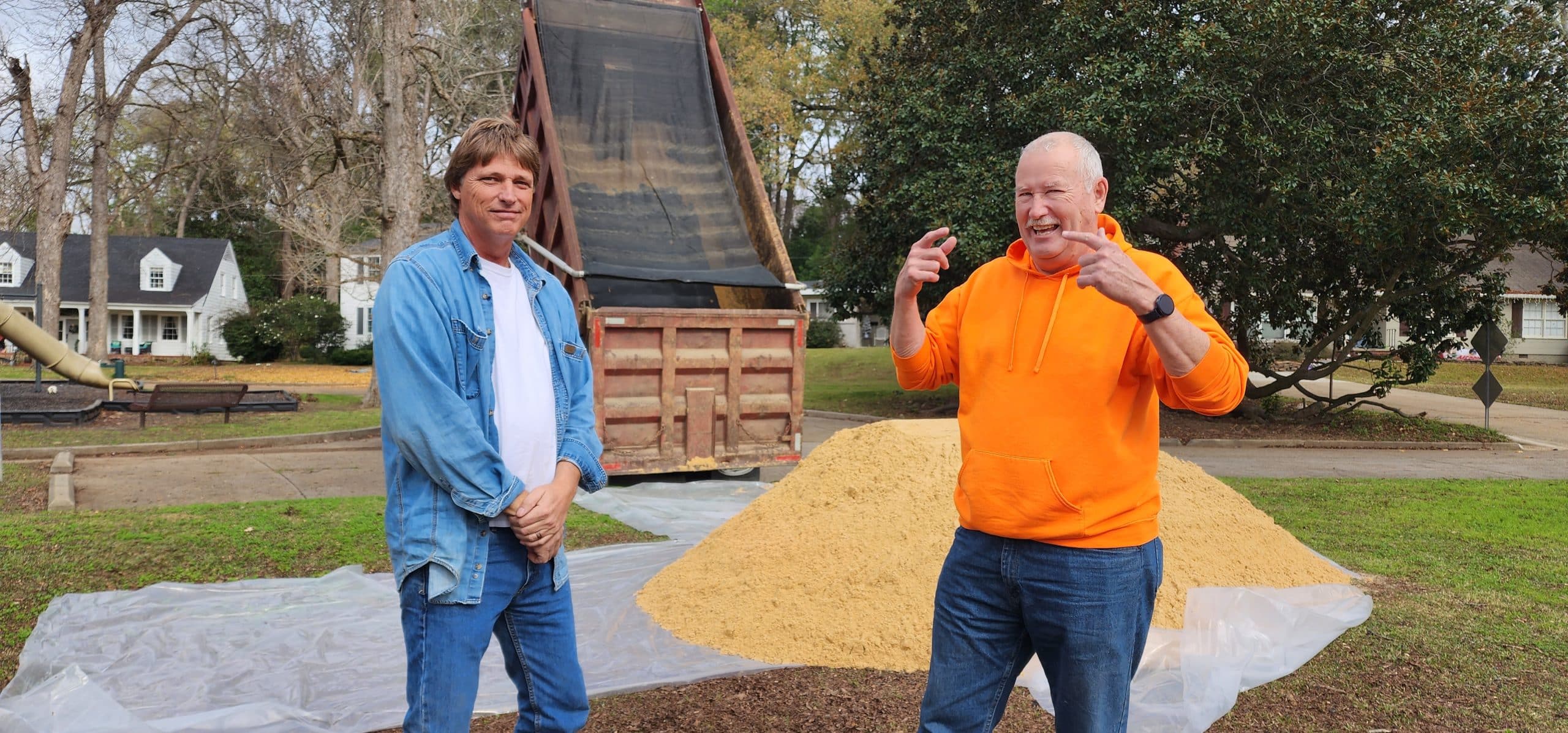 Stan Collins and Greg Sparks. Collins donates the sand every year in memory of his departed wife and son. Photo by David Day