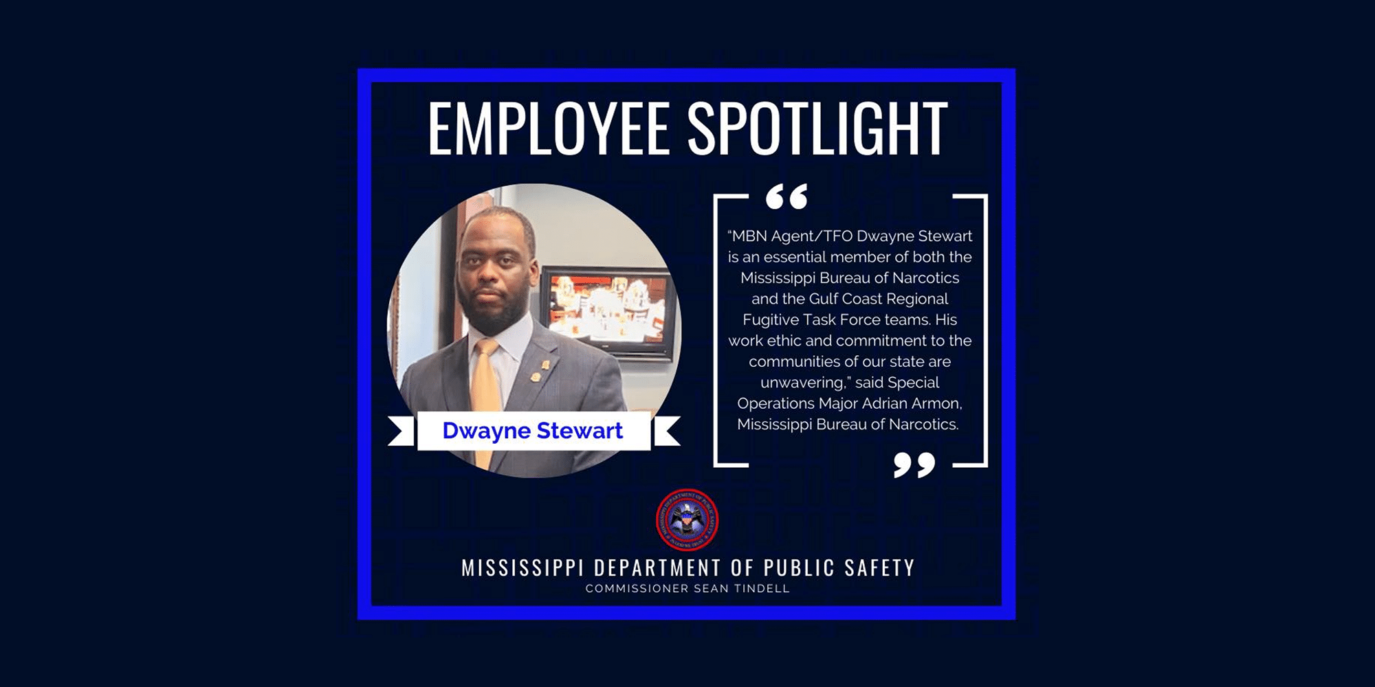VICKSBURG, Miss. (Vicksburg Daily News) – Commissioner Sean Tindell has recognized Mississippi Bureau of Narcotics (MBN) Agent/Task Force Officer (TFO) Dwayne Stewart for July’s Employee Spotlight.