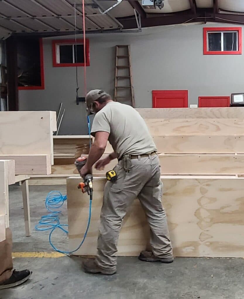Zach Weber worked all day to prepare the ramp to carry the casket atop the fire truck (photo by David Day)