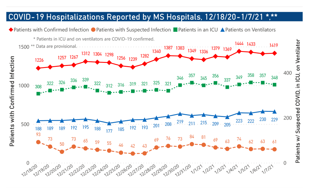 The number of Mississippians hospitalized for the virus as of 6 p.m. Thursday, Jan. 7, was 1,480. The number includes 1,419 with confirmed cases of COVID-19 and 61 people with suspected but unconfirmed cases. Of those with confirmed infections, 348 were critically ill and in intensive care units and 229 were on ventilators.