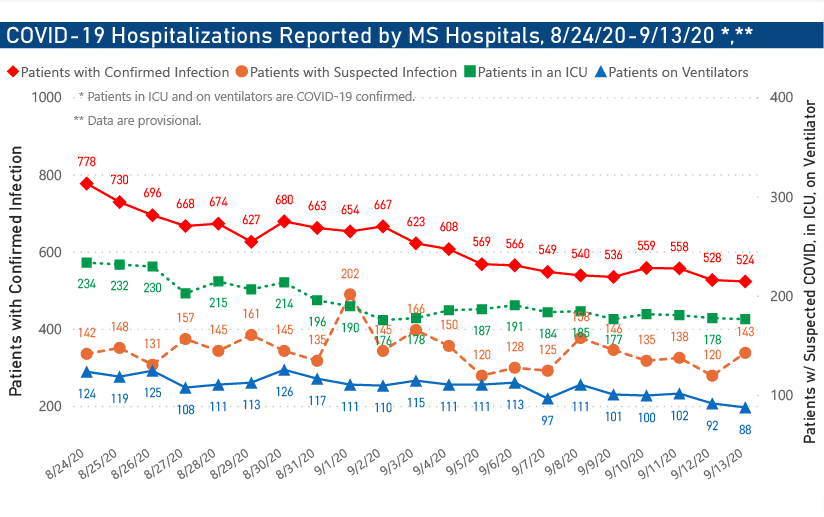 The number of Mississippians hospitalized for the virus as of 6 p.m. Sunday, Sept. 13, is 667, showing a clear downward trend after peaking in late July at more than 1,200. The number includes 524 with confirmed cases of COVID-19 and 143 people with suspected but unconfirmed cases. Of those with confirmed infections, 177 were critically ill and in intensive care units and 88 were on ventilators.