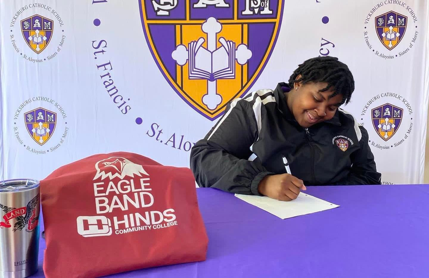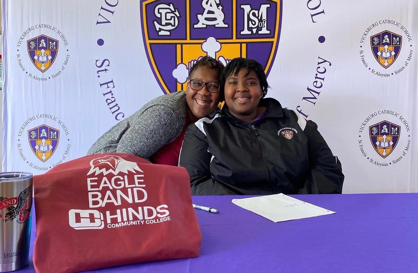 St. Aloysius High School student Iber Davis signed a band scholarship to Hinds Community College on Monday.
