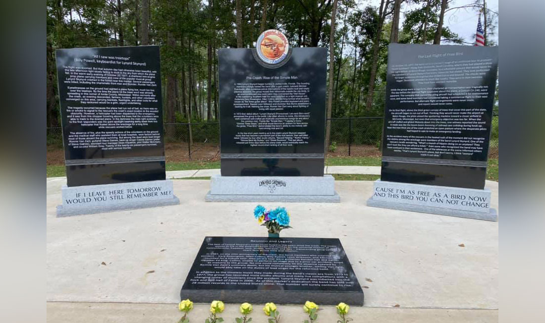 For years, Frynds of Lynyrd Skynyrd have worked to erect a monument near the crash site and ensure fans can find it. Last year, a beautiful monument was unveiled at Mississippi Highway 568 and Easley Road in Pike County telling the story of the band and the crash. This year, the Frynds are celebrating Mississippi’s erecting signage on Interstate 55 south of Magnolia and near the monument itself so that fans can easily find the monument.