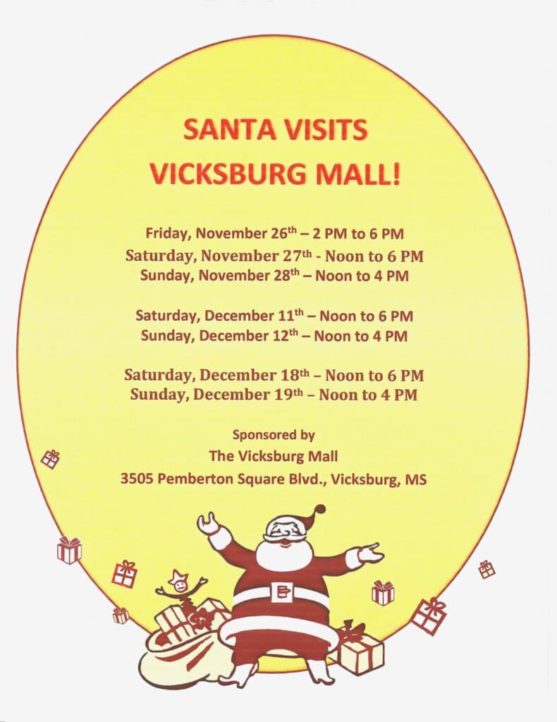 Santa will be at the Vicksburg Mall at the following times and dates: