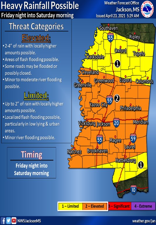 Rainfall is anticipated sporadically throughout Friday through Saturday morning. There is a strong possibility that flash flooding will occur. We are closely monitoring the situation and will bring you additional updates later today. Please charge your electronic devices and cell phones, as with any weather event in our area, power outages are a distinct possibility.