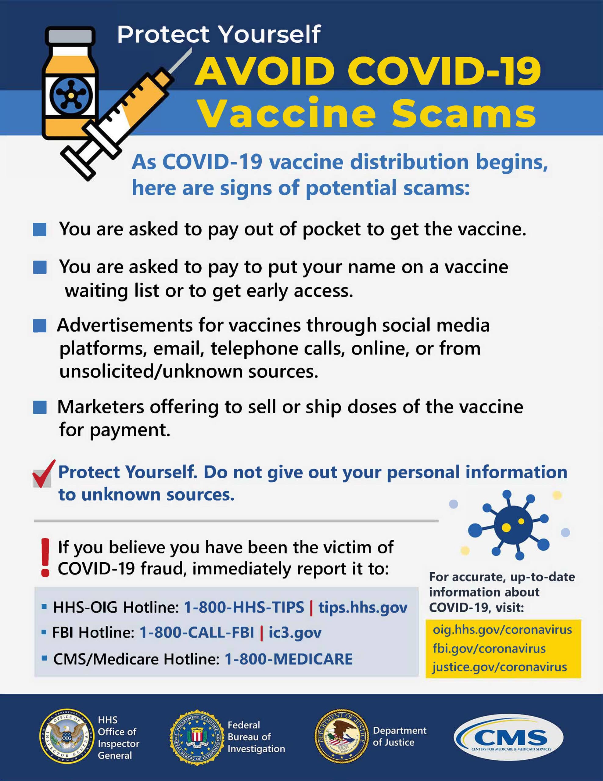 #NEW: As distribution of #COVID19 vaccines begins, watch for signs of potential scams. Scammers may ask you to pay out of pocket for the #vaccine or for early access to it. They may also ask you to pay to put your name on a vaccine waiting list. https://t.co/MJmfZgTO50 pic.twitter.com/sTfcJPXKCU