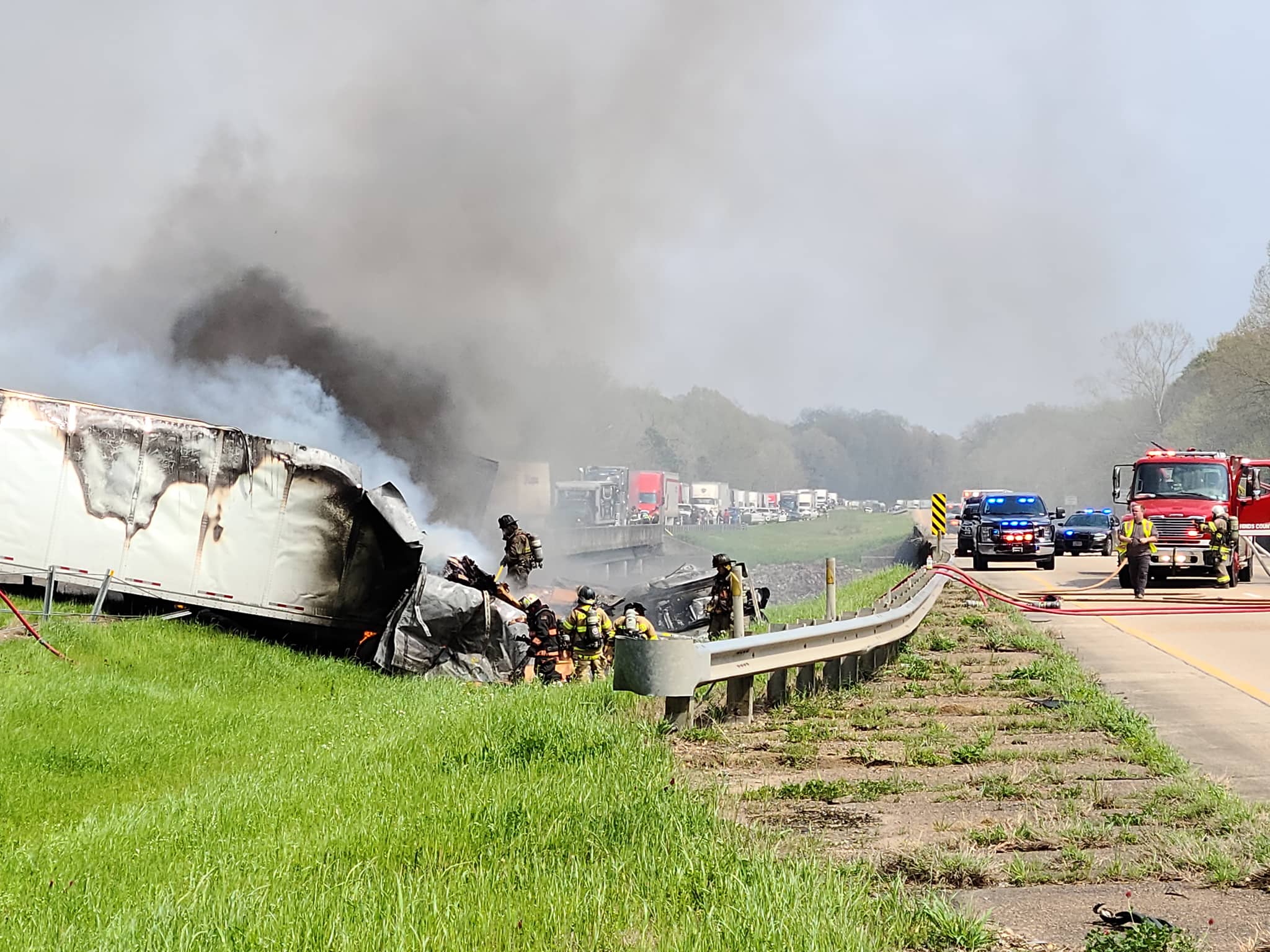 Hinds and Warren County along with Vicksburg Fire personnel are battling a fire that erupted as a result of the crash. Also on the scene are Hinds and Warren County deputies, Vicksburg Police, Emergency Management, and a Hazmat team.
