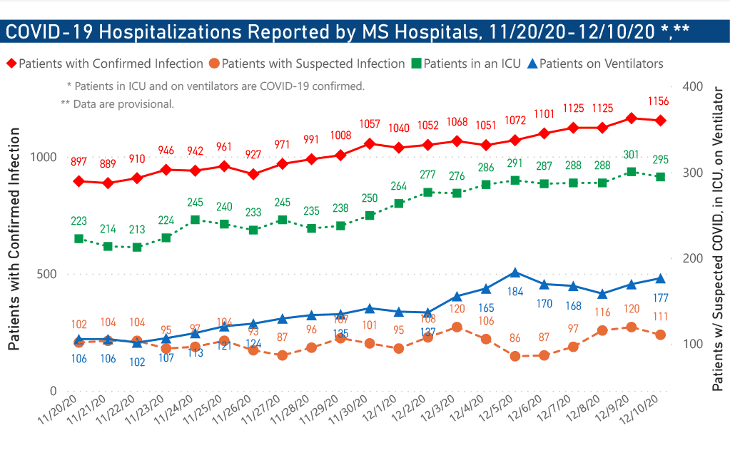 The number of Mississippians hospitalized for the virus as of 6 p.m. Thursday, Dec. 10, was 1,267. The number includes 1,156 with confirmed cases of COVID-19 and 111 people with suspected but unconfirmed cases. Of those with confirmed infections, 295 were critically ill and in intensive care units and 177 were on ventilators.