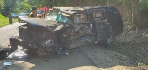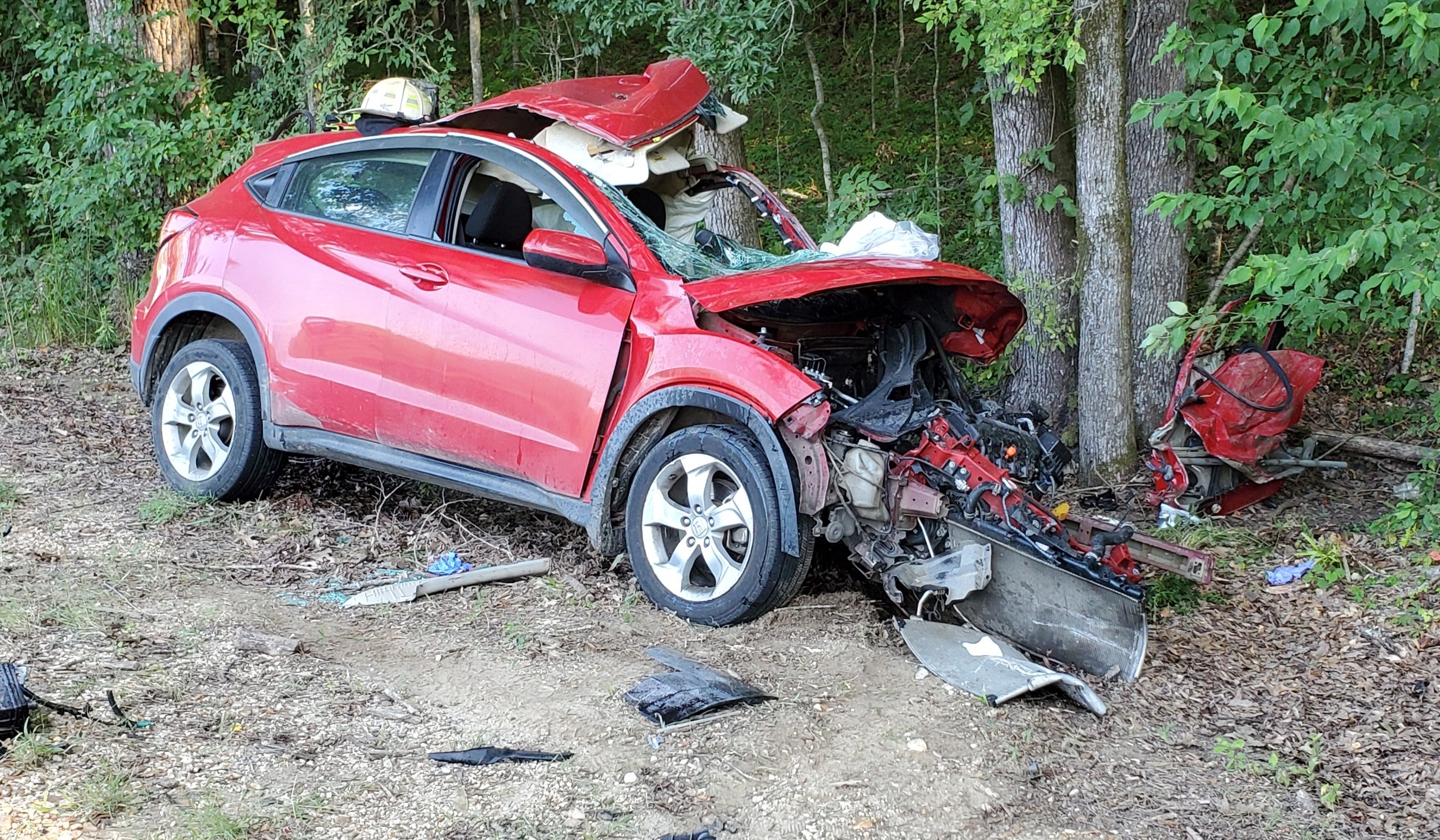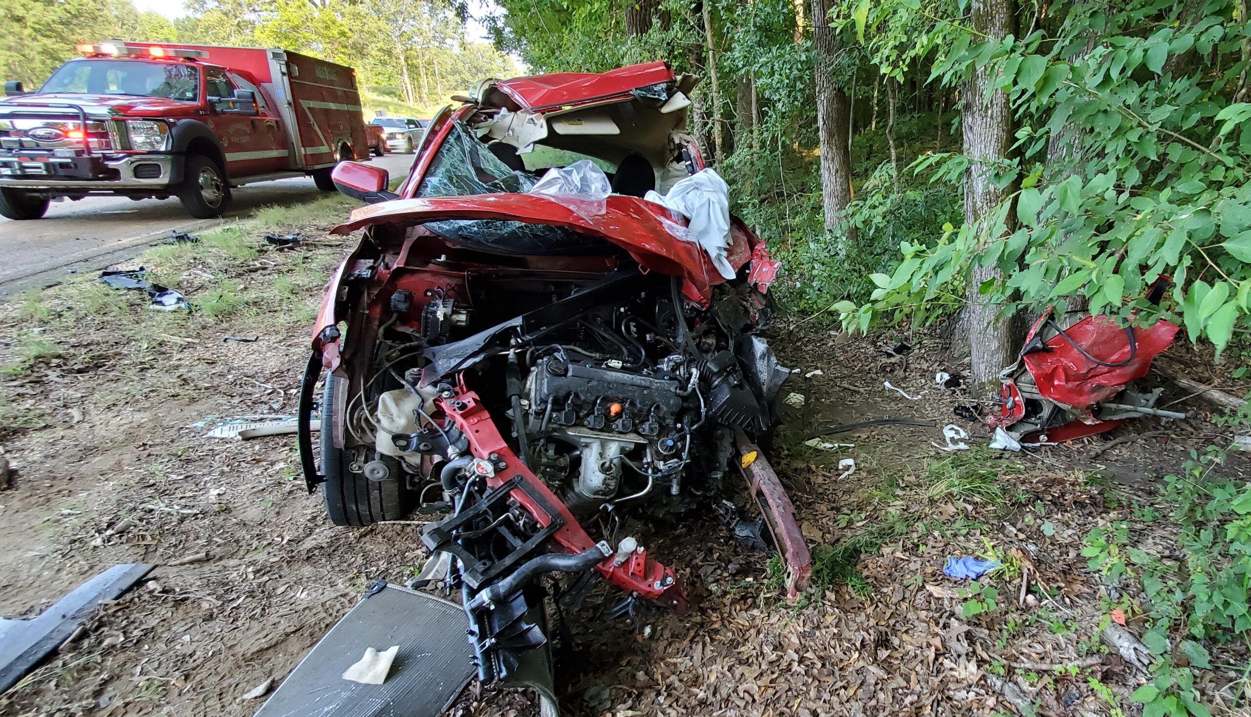 A black Cadillac Escalade appears to have been t-boned by a red Honda Civic. At this point, it is too early in the accident investigation to determine exactly what happened beyond that obvious impact evidence.