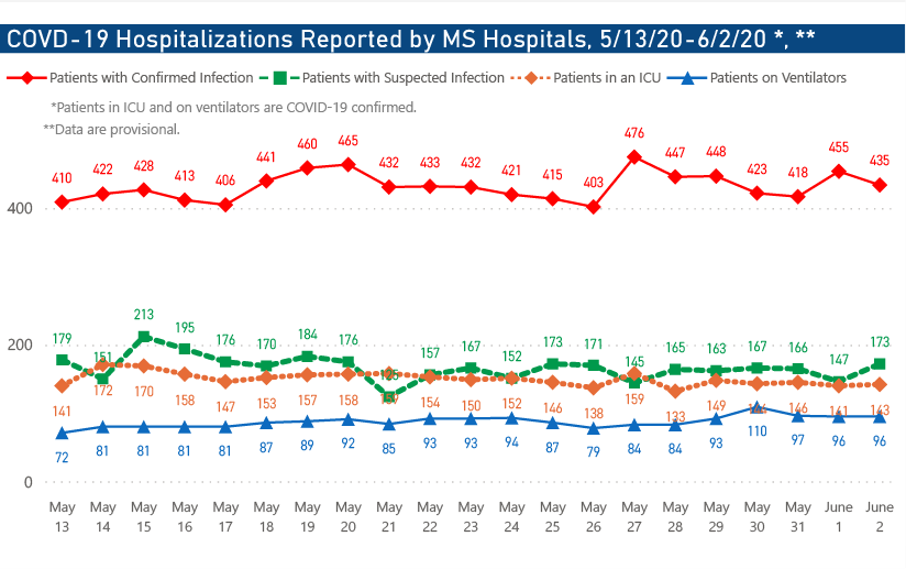 As of Wednesday, 435 Mississippians were hospitalized with confirmed cases of COVID-19, and another 173 patients are hospitalized with suspected infections. Of those hospitalized with confirmed infections, 143 are critically ill and in intensive care units and 96 are on ventilators. Hospitalizations were not updated Thursday as of this writing.