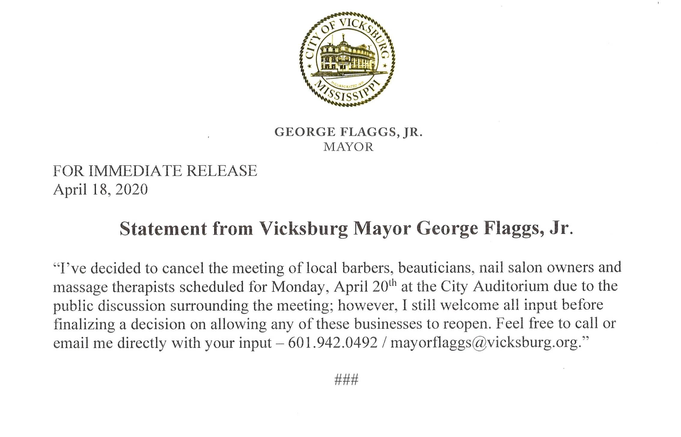 News Flaggs cancels Monday meeting with business owners Published 6 years ago on April 18, 2020 By Staff Reports Mayor George Flaggs Jr. during his April 6 Facebook live Q&A. (Screen grab from video by Thomas Parker) See a typo? Report it here. Related Topics:COVID-19 coronavirusFeatured Up Next Central Mississippi in for another bumpy ride with severe storms today Don't Miss Mississippi prisons and jails have the potential of quickly becoming COVID-19 hot spots Continue Reading Advertisement You may like VWSD outlines COVID-19 preparations for upcoming school year Here’s how $1 billion can be spent for education in Mississippi 1,395 new COVID-19 cases in Mississippi Thursday as hospitalizations rise sharply New statewide COVID-19 cases fall below 1,000 Thursday; Warren County adds 14 cases Reeves: ‘Our hospital system is stretched to pain’ Another COVID-19 death in Warren County Wednesday