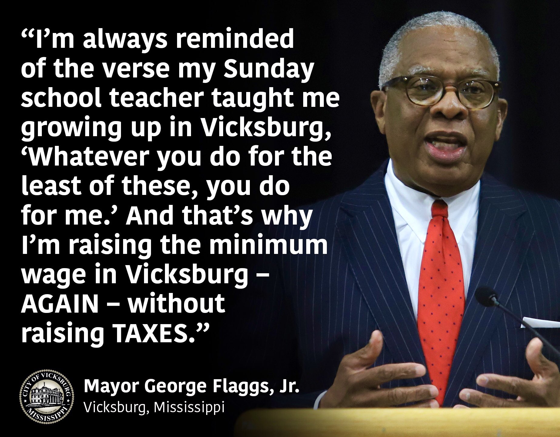 “I’m always reminded of the verse my Sunday school teacher taught me growing up in Vicksburg, ‘Whatever you do for the least of these, you do for me.’ And that’s my I’m raising the minimum wage in Vicksburg – AGAIN – without raising TAXES,” Flaggs wrote.