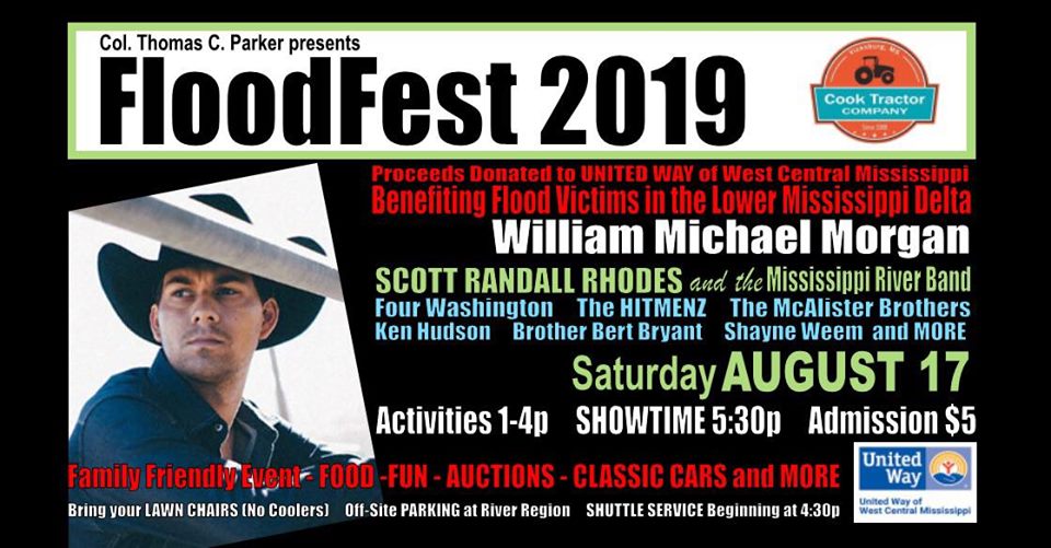 Appearing on the Cook Tractor Company Stage will be-Scott Randall Rhodes and the Mississippi River Band, Shayne Weems, Brother Bert Bryant, Flyin’ Solo with Ken Hudson, The McAllister Brothers, Four Washington, Ben Dew, The Hitmenz, along with A Special Appearance from Sheriff Martin Pace. Our featured performer and co-host are Vicksburg’s own William Micheal Morgan, presented by Cook Tractor Company. Mayor George Flaggs Jr. will be on hand to make a special presentation to Morgan.