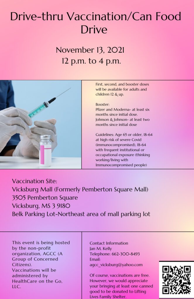 A free drive-thru vaccination and canned food drive will take place Nov. 13 at the Vicksburg Mall (formally Pemberton Square Mall). Vaccinations will be administered from noon to 4 p.m. Vaccinations will be administered by HealthCare on the Go, LLC.
