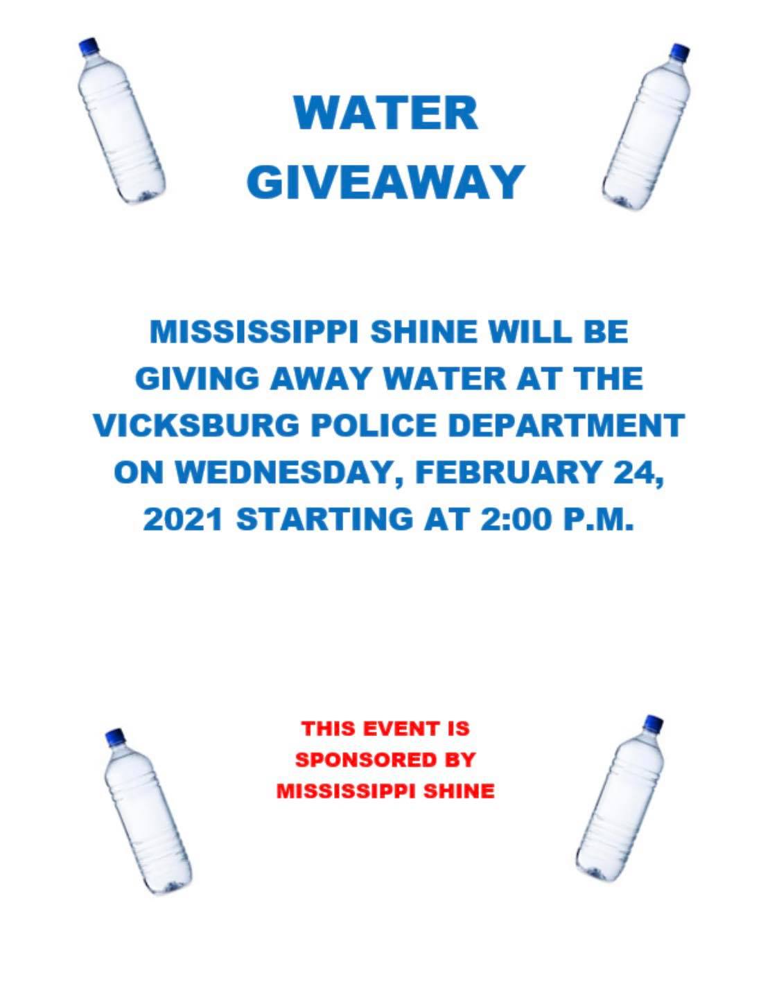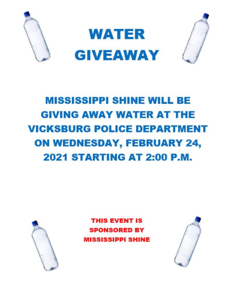 Mississippi Shine has organized a free water giveaway that will begin at 2 p.m. Wednesday at the Vicksburg Police Department.