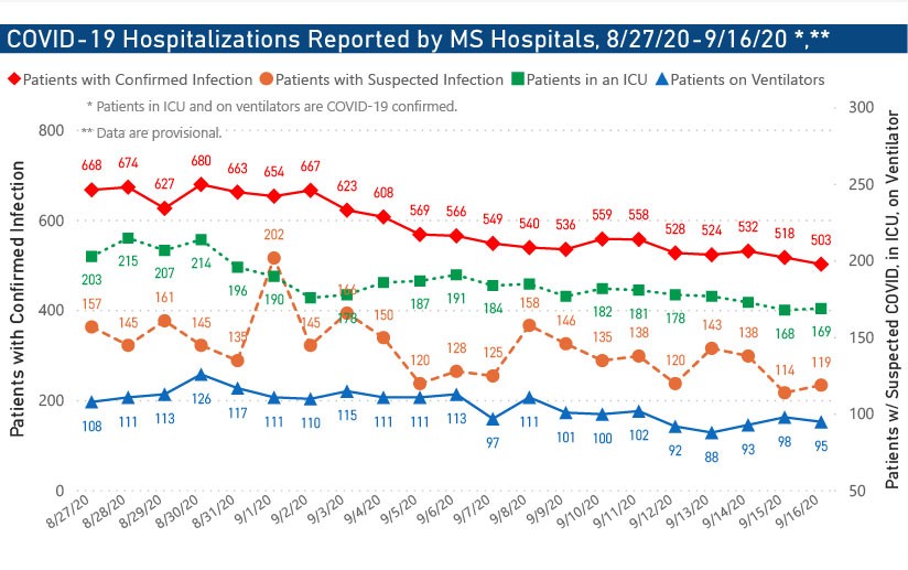 The number of Mississippians hospitalized for the virus as of 6 p.m. Wednesday, Sept. 16, is 622, showing a clear downward trend after peaking in late July at more than 1,200. The number includes 503 with confirmed cases of COVID-19 and 119 people with suspected but unconfirmed cases. Of those with confirmed infections, 169 were critically ill and in intensive care units and 95 were on ventilators.
