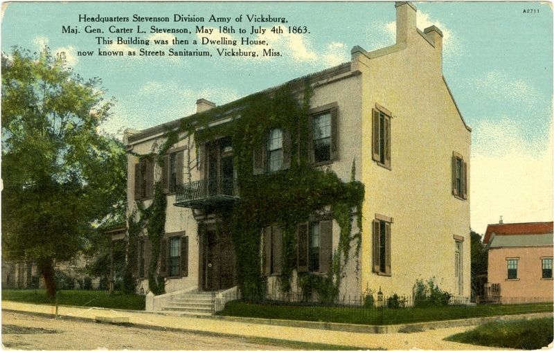 During the Civil War the house was used by Major General Carter L. Stevenson as the headquarters of Stevenson’s Division, Army of Vicksburg from May 18 to July 4, 1863. If there was any question as to whether this was the house used for this purpose, it was answered when the Vicksburg Herald reported on July 1, 1903 that Major John W. Johnston had recently visited Vicksburg to confer with Captain Rigby of the National Park Commission “relative to certain matters regarding the headquarters of General C. L. Stevenson.” He affirmed that “the headquarters of Maj. Gen. Stevenson and staff during the siege of Vicksburg and prior thereto, were in the building (then a two-story one with large attic, with kitchen (one story) and servants quarters (two stories detached) now forming the front of Street’s Sanitarium.” He further states that, soon after the surrender of Vicksburg, Gen. Stevenson moved his headquarters from the building, which was then occupied for office purposes, by Gen. Frye, provost marshal of Gen. Grant’s army, except that he, Major Johnston, retained a room, for himself and clerk, he then acted as provost marshal for purpose of paroling the officers and men of Stevenson’s Division.” After the war, McCutchen was in business as a cotton factor with McCutchen, Folkes and Company.