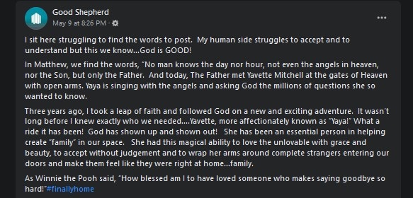 She made a lasting impact at Good Shepherd, which was echoed in a post on social media.