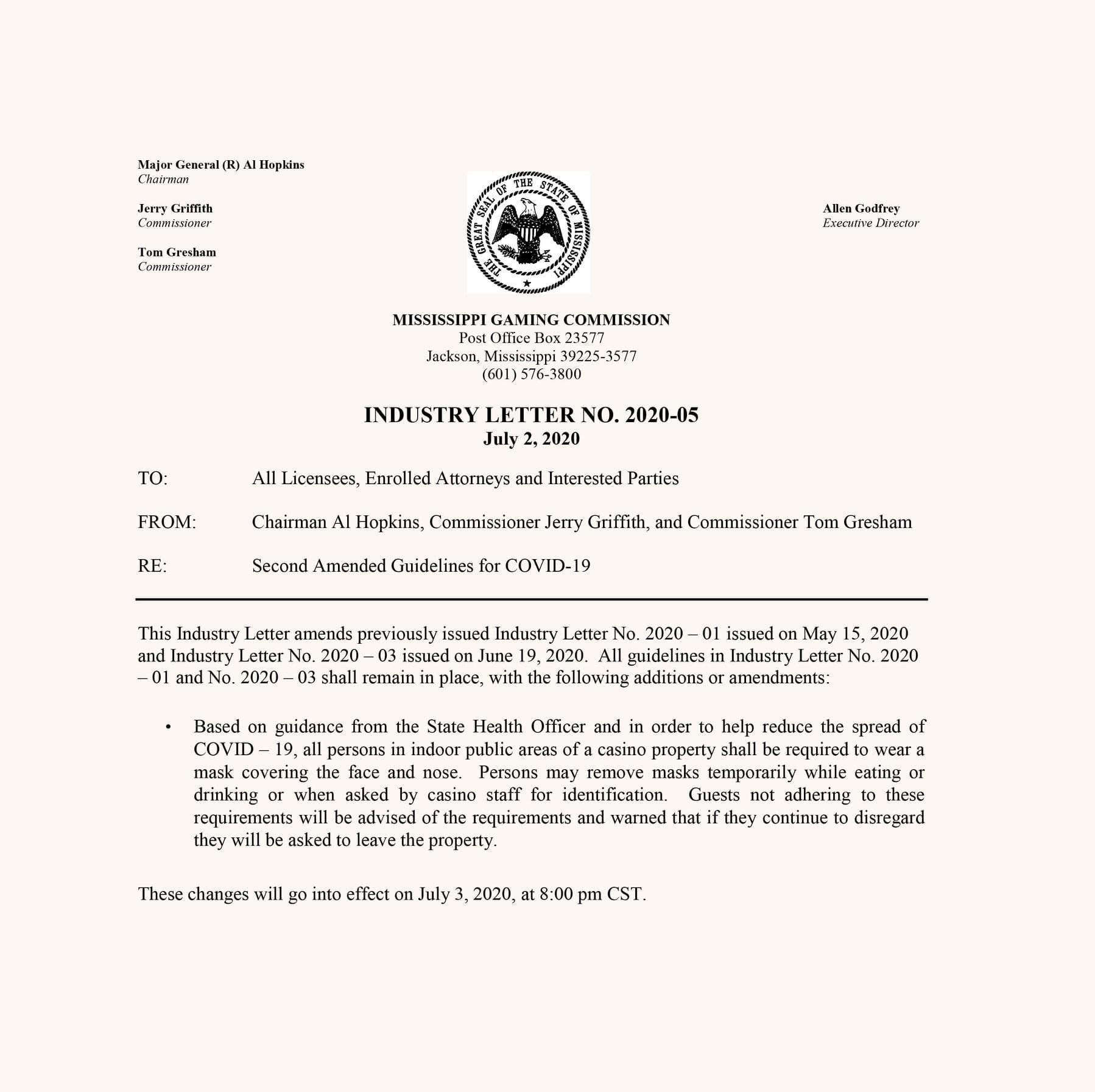 Thursday, the Mississippi Gaming Commission issued a mandate that all persons entering casinos in the state be required to wear face masks due to the ongoing COVID-19 pandemic.