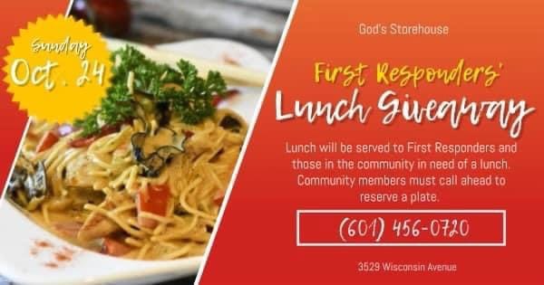 God's Storehouse is hosting a lunch giveaway for first responders on Sunday. Lunch orders must be called in ahead of time by 11 a.m. at 601-456-0720.