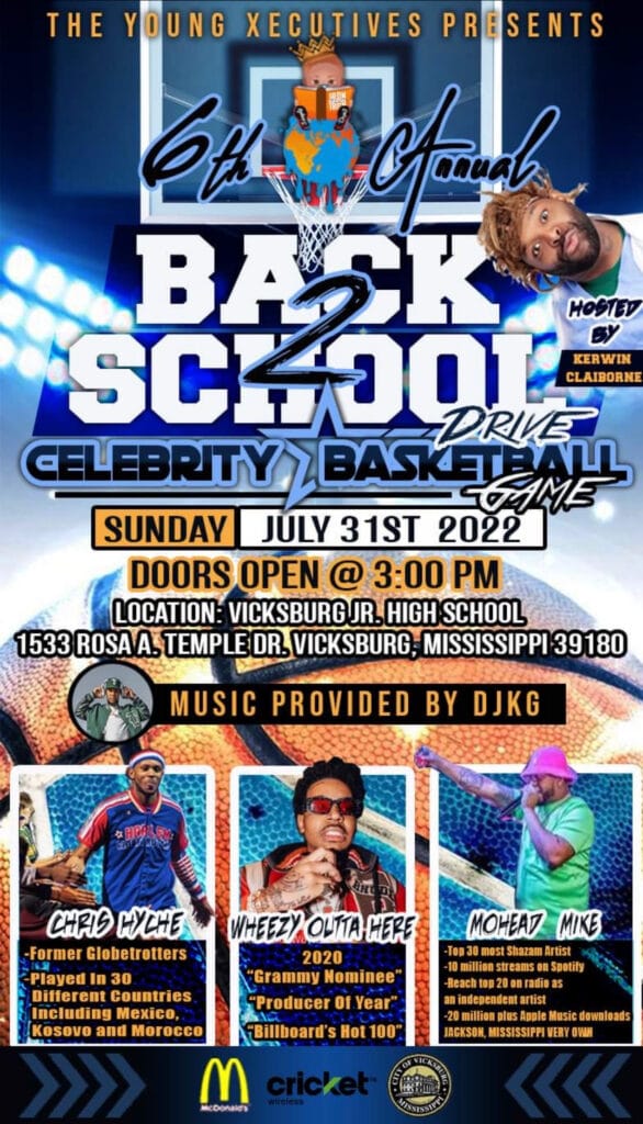 The sixth annual Back 2 School Celebrity Basketball Tournament will be held at Vicksburg Junior High School on July 31. The event is being brought together Vicksburg native Jeremi Meekins and hosted by Kerwin Claiborne along with music by DJ KG.