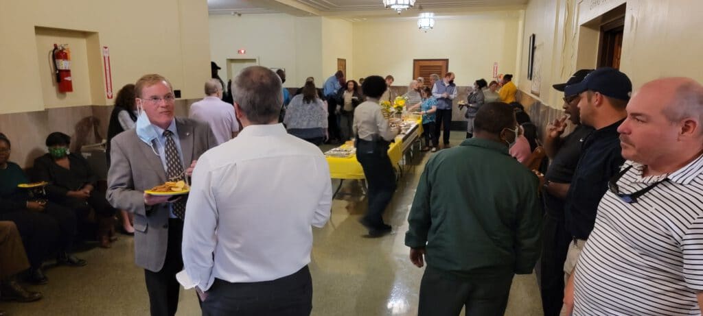 After the send-off, the crowd enjoyed mingling and a buffet of snacks in the adjacent hall.