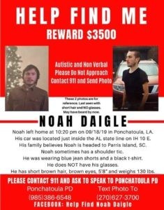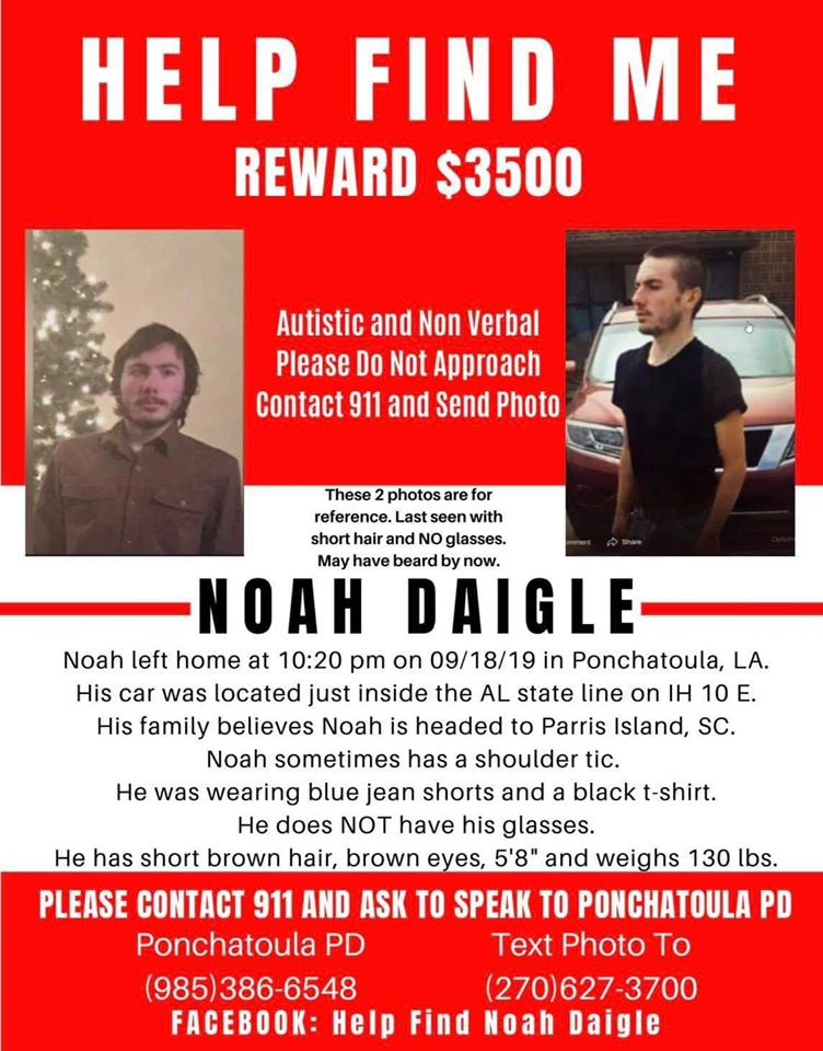 Noah Daigle, was last seen Sept. 18, leaving his home in Ponchatoula, La. The 19-year-old is autistic and nonverbal.