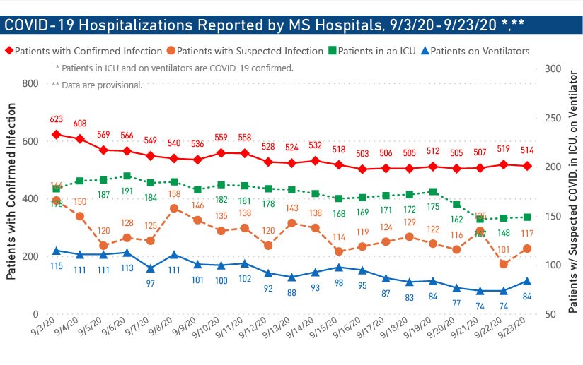 The number of Mississippians hospitalized for the virus as of 6 p.m. Wednesday, Sept. 23, is 631, about half of the late July peak of more than 1,200. The number includes 514 with confirmed cases of COVID-19 and 117 people with suspected but unconfirmed cases. Of those with confirmed infections, 149 were critically ill and in intensive care units and 84 were on ventilators.