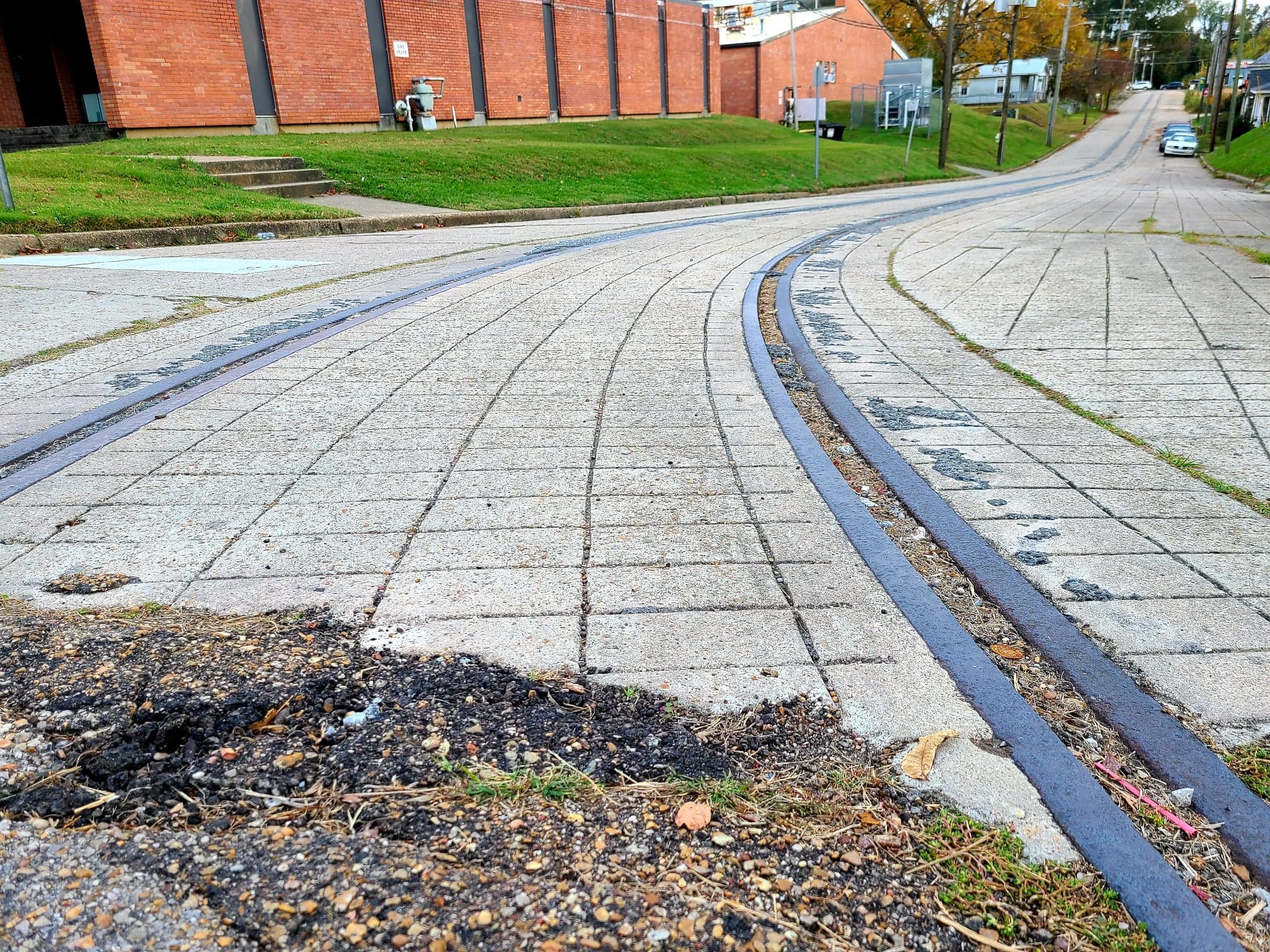 Tracks still remain embedded in some of Vicksburg’s oldest streets, like these on Howard St. (photo by David Day)