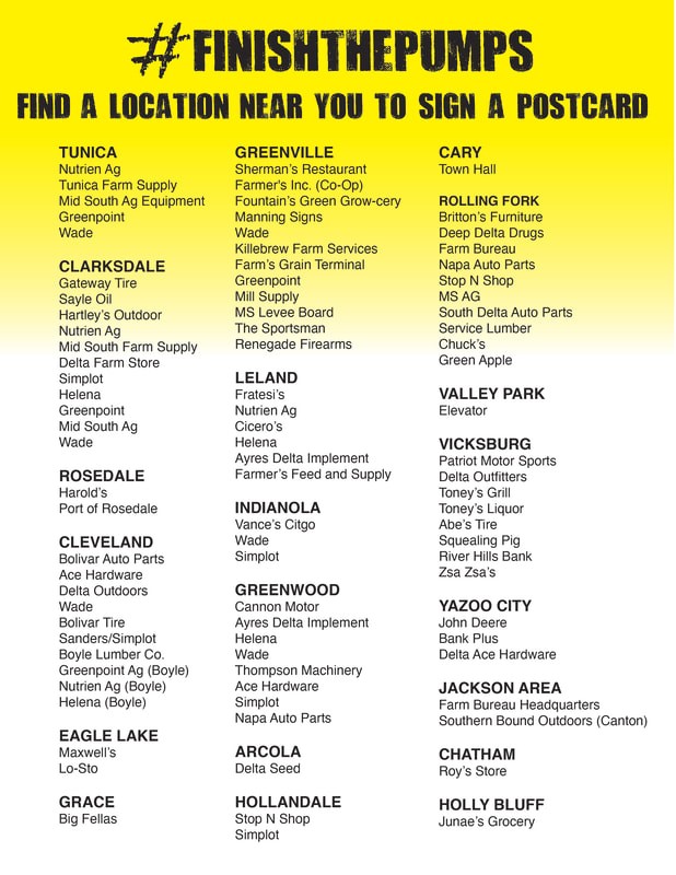 In addition, a grassroots postcard campaign has put postcards and collection boxes at numerous communities in the Mississippi Delta and Jackson area. The location of postcard signing sites can be found below: