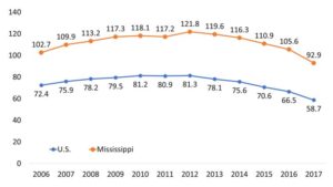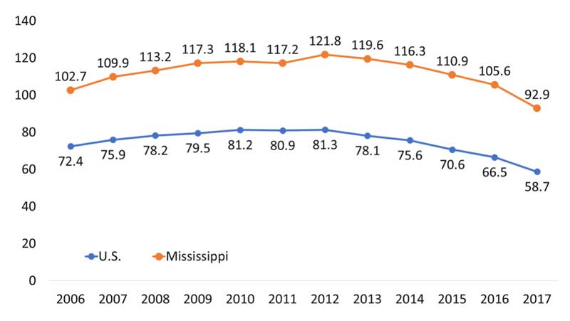 Opioid prescribing rate per 100 persons, U.S. and Mississippi, 2006 to 2017. Source: National Institute on Drug Abuse, CDC and IQVIA Xponent 2006–2017.