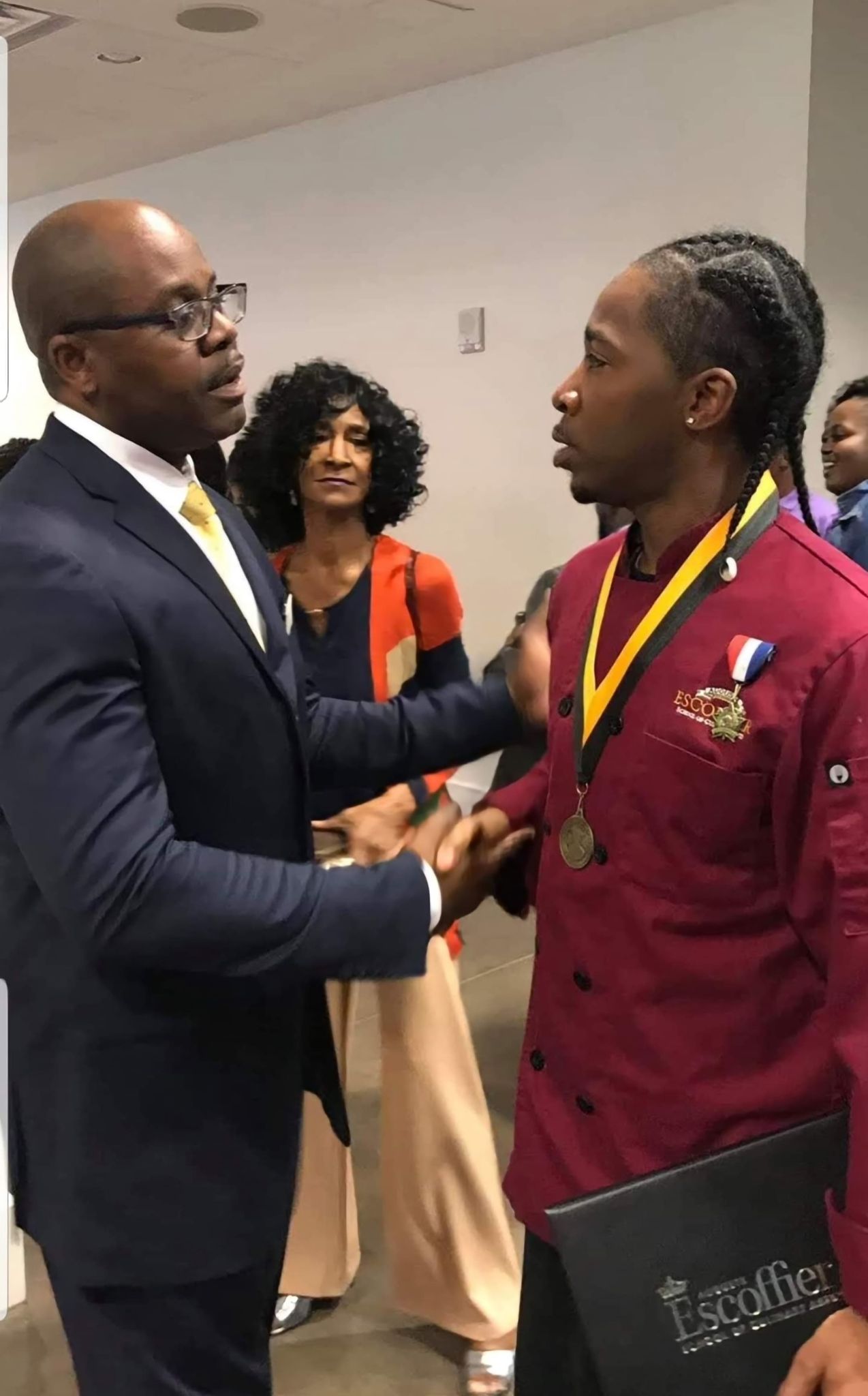 Chef Tillman shaking hands with the dean at his graduation from culinary school as his mother looks on (credit: Shannon Tillman).
