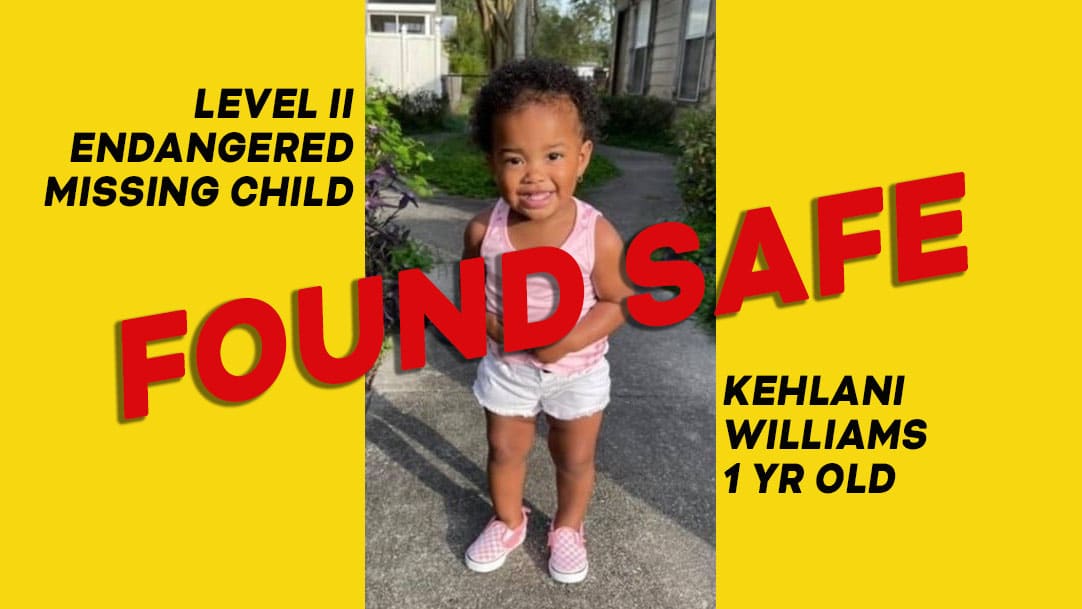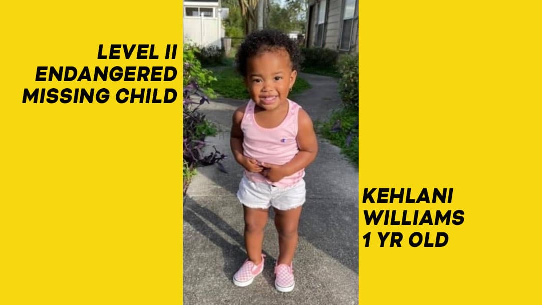 Kehlani Williams is a 1-year-old black female with black hair and brown eyes. She is approximately 2 to 3 feet tall and weighs between 20 and 30 pounds. She was last seen wearing pink clothing with no shoes.
