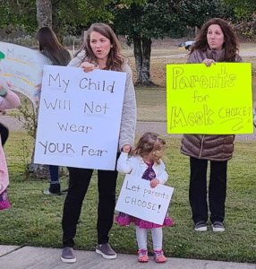 The School Board met on Thursday to discuss the possibility of ending the mandate. A group of concerned parents and citizens gathered outside the administrative building in a show of their desire to choose for themselves whether or not their children should wear masks.