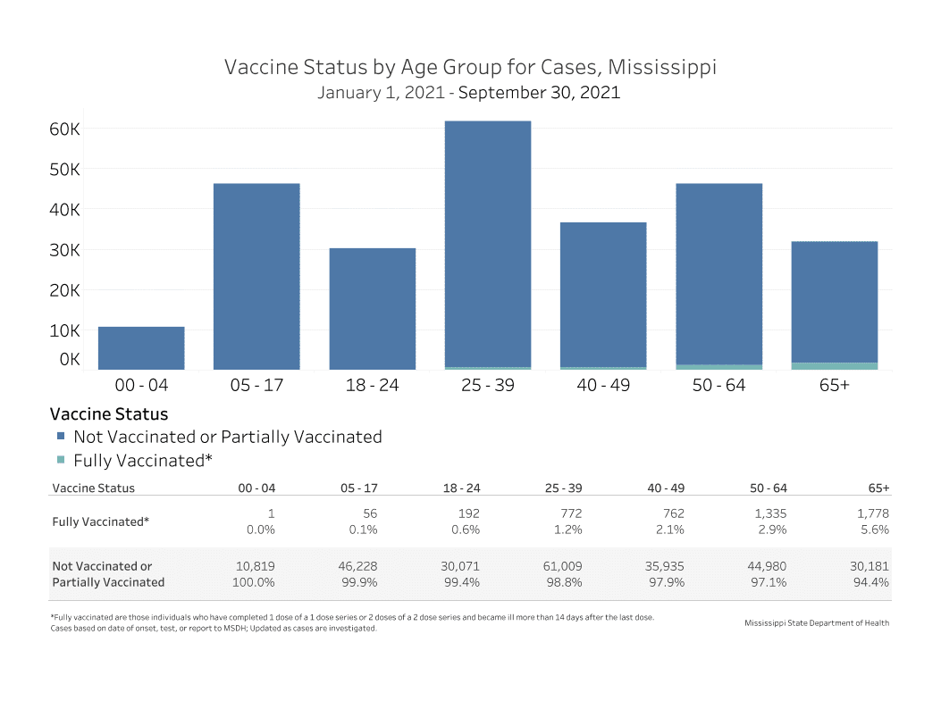 MSDH reports that of all COVID-19 cases this year in individuals age 0-49 years, only 4% were fully vaccinated. In cases affecting individuals age 50 to 65, 3% were fully vaccinated. And finally, looking at cases in the oldest group, 65 years and older, fully vaccinated individuals made up 5.6% of cases.