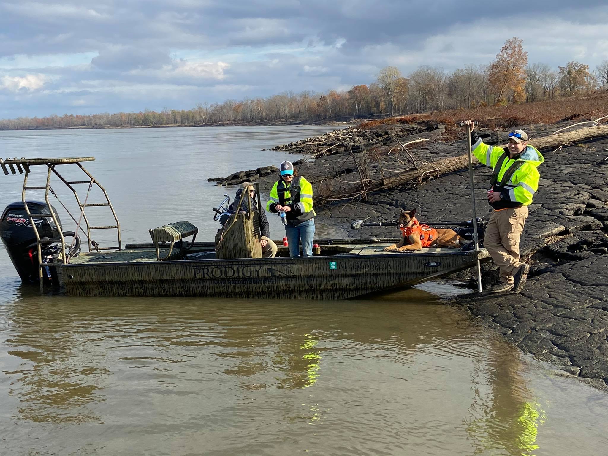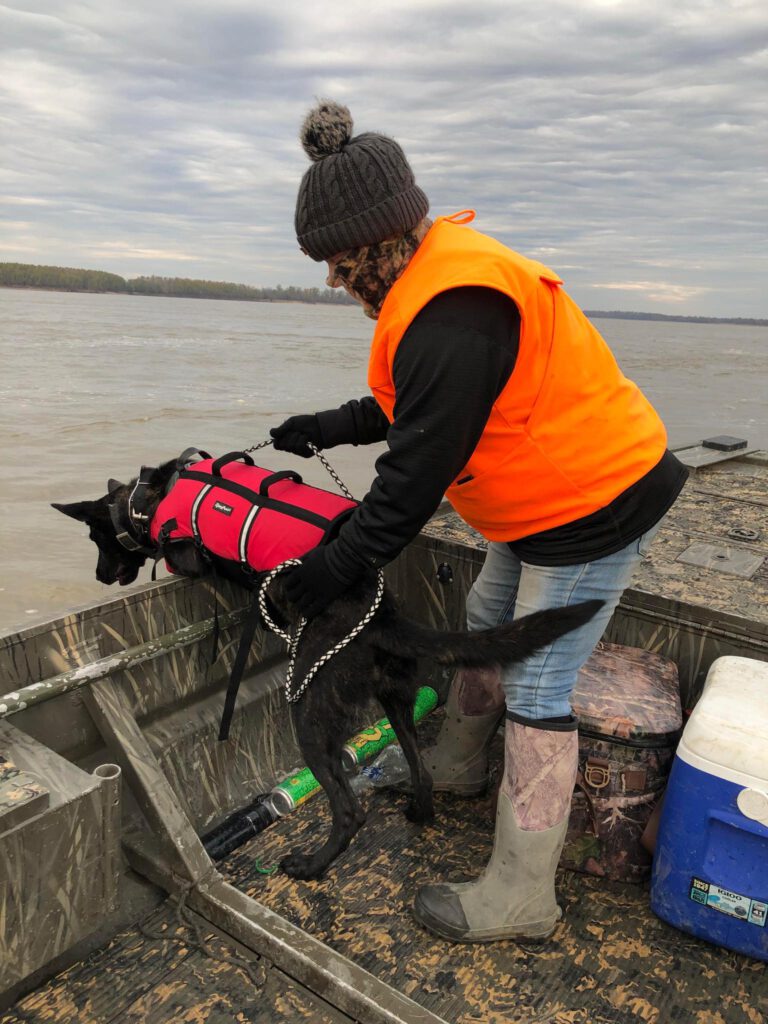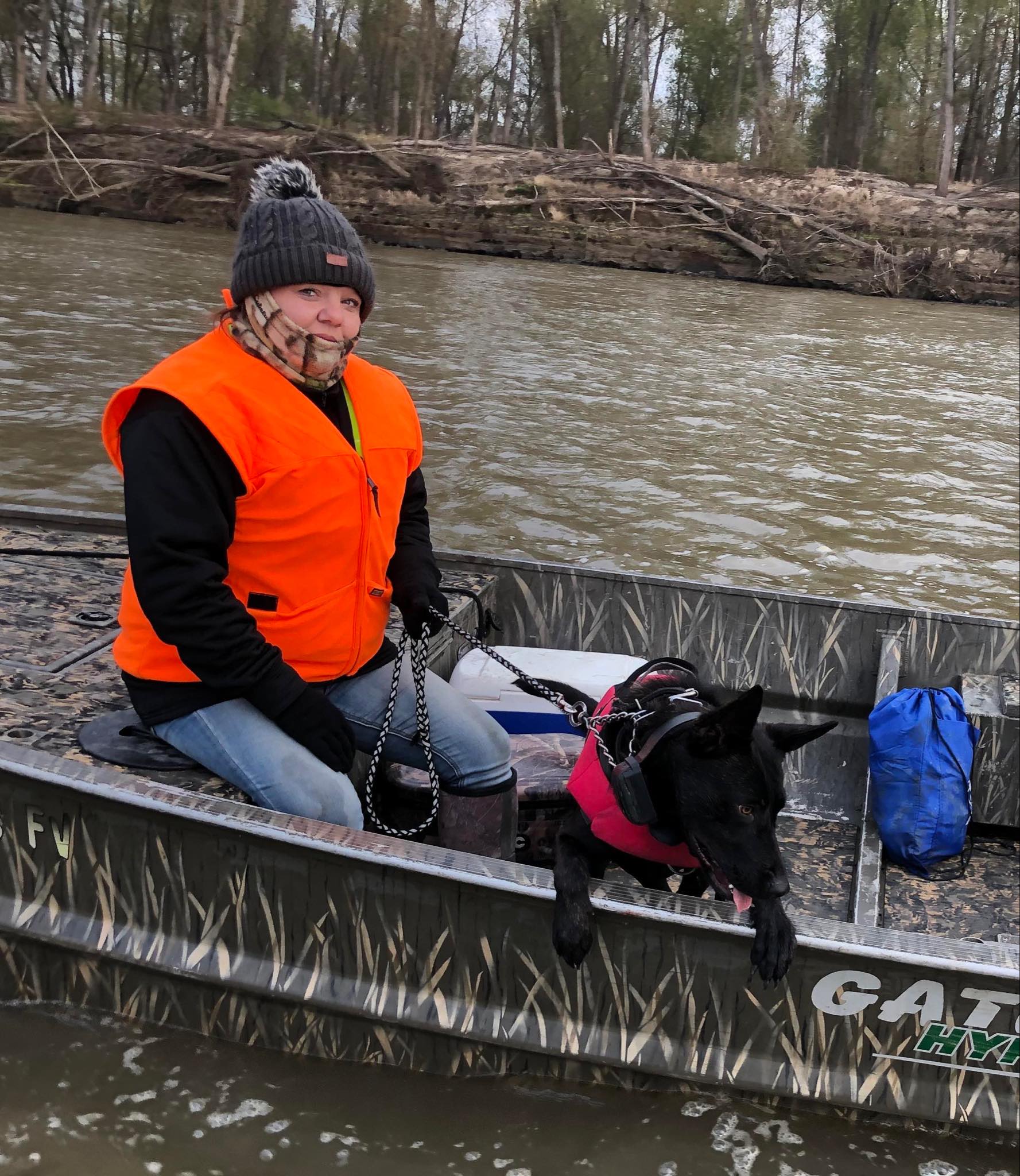 Brandi Brignac with Mercy, searching the river for signs of the missing hunters (photo courtesy of Mercy Search and Rescue).