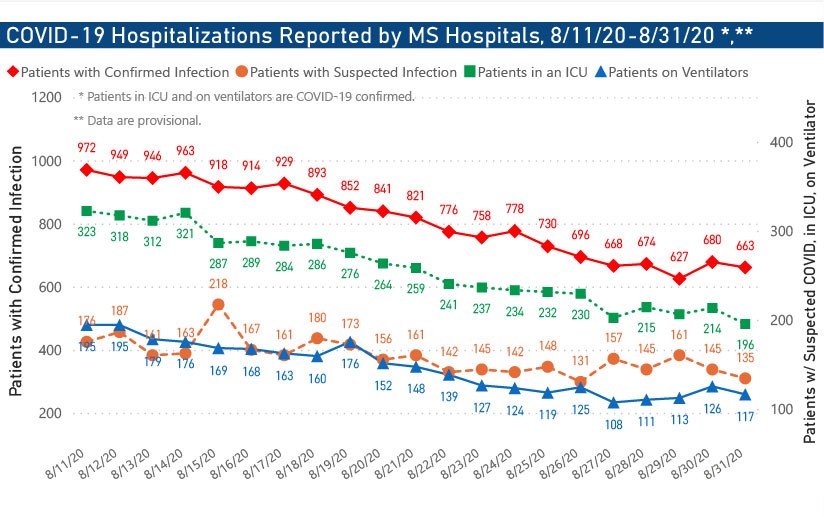 The number of Mississippians hospitalized for the virus as of 6 p.m. Monday, Aug. 31, is 798, showing a clear downward trend after peaking in late July at more than 1,200. The number includes 663 with confirmed cases of COVID-19 and 135 people with suspected but unconfirmed cases. Of those with confirmed infections, 196 were critically ill and in intensive care units and 117 were on ventilators.