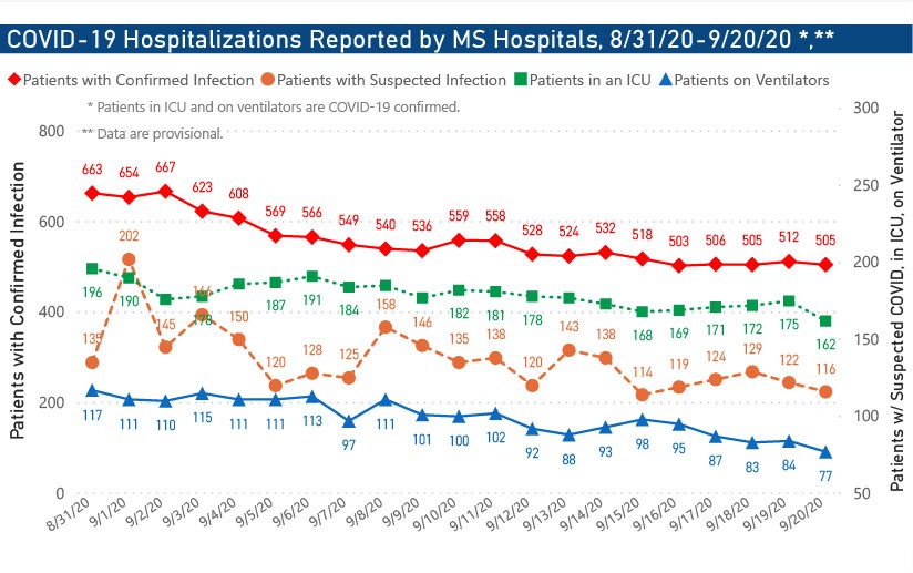 The number of Mississippians hospitalized for the virus as of 6 p.m. Sunday, Sept. 20, is 621, about half of the late July peak of more than 1,200. The number includes 505 with confirmed cases of COVID-19 and 116 people with suspected but unconfirmed cases. Of those with confirmed infections, 162 were critically ill and in intensive care units and 77 were on ventilators.