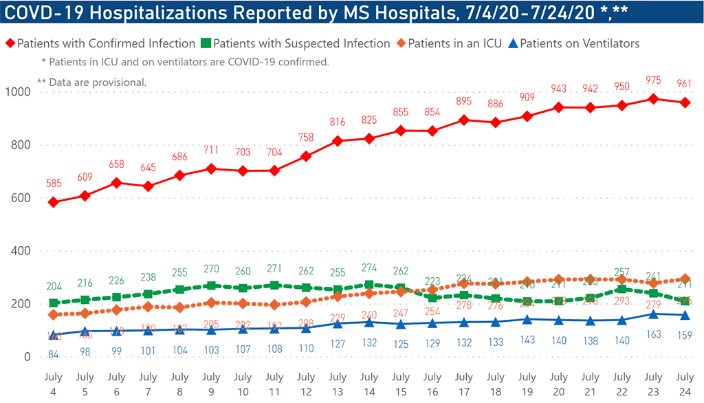 The number of Mississippians hospitalized for the virus as of 6 p.m. Thursday, July 23, is 1,172. The number includes 961 with confirmed cases of COVID-19 and 211 people with suspected but unconfirmed cases. Of those with confirmed infections, 295 were critically ill and in intensive care units and 159 were on ventilators.