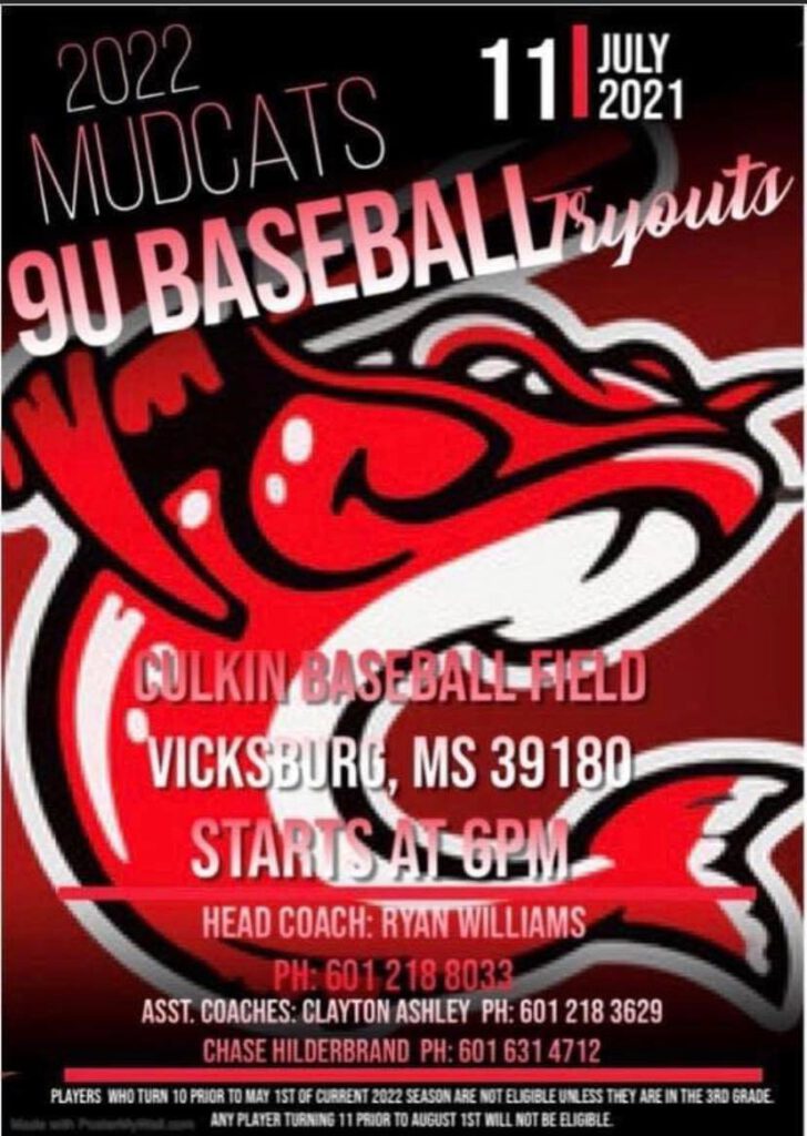 The Mississippi Mudcats 9U baseball team will host tryouts July 11 at 6 p.m.