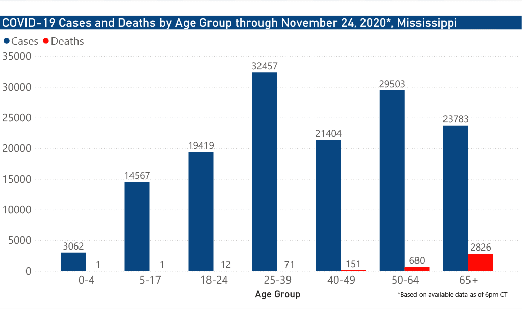 At the beginning of the crises, the age group with the most COVID-19 cases were those over 65. Now, most new cases are seen in younger people who are more likely to survive the virus than those 65 and older. In September, the age group reporting the most cases in Mississippi were 18 to 24 years old. That has shifted to a slightly older group. In November, the age group reporting the most cases in Mississippi are from 25 to 39 years old followed by those 50 to 64 years old.