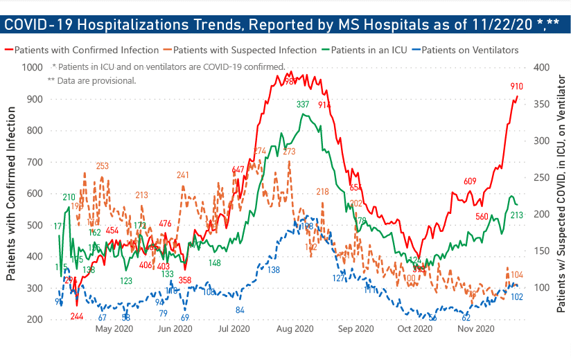 The number of Mississippians hospitalized for the virus as of 6 p.m. Tuesday, Nov. 24, was 1,039, about 87% of the late July peak of about 1,200. The number includes 942 with confirmed cases of COVID-19 and 97 people with suspected but unconfirmed cases. Of those with confirmed infections, 245 were critically ill and in intensive care units and 113 were on ventilators.