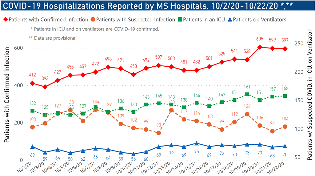 The number of Mississippians hospitalized for the virus as of 6 p.m. Thursday, Oct. 22, is 701, more than half of the late July peak of about 1,200. The number includes 597 with confirmed cases of COVID-19 and 104 people with suspected but unconfirmed cases. Of those with confirmed infections, 158 were critically ill and in intensive care units and 70 were on ventilators.